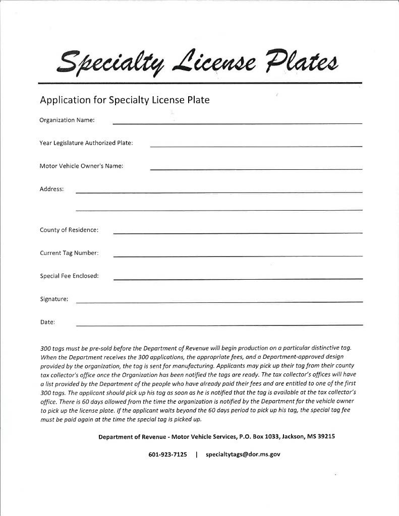 We must pre-sell 300 tags before they can be produced. Please fill out the required application form and email it to aharris7@mc.edu. You can also pay your fee below. After the 300 tags have been pre-sold, we can submit the paperwork and money to the Department of Revenue. You do not have to be an alumni nor a student to reserve the tag. If you have any questions, please contact Mandy Harris at 601-925-7111 or email her at aharris7@mc.edu.